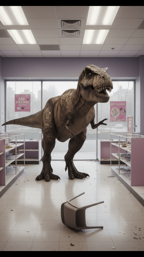 Image Credit: OpenAI Image Creator. Tyrannosaurus Rex misplaced among accessories.