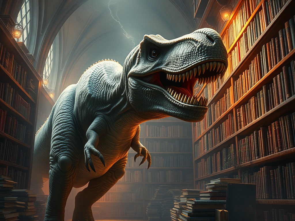 Image Credit: OpenAI Image Creator: Tyrannosaurus Rex amongst tomes.