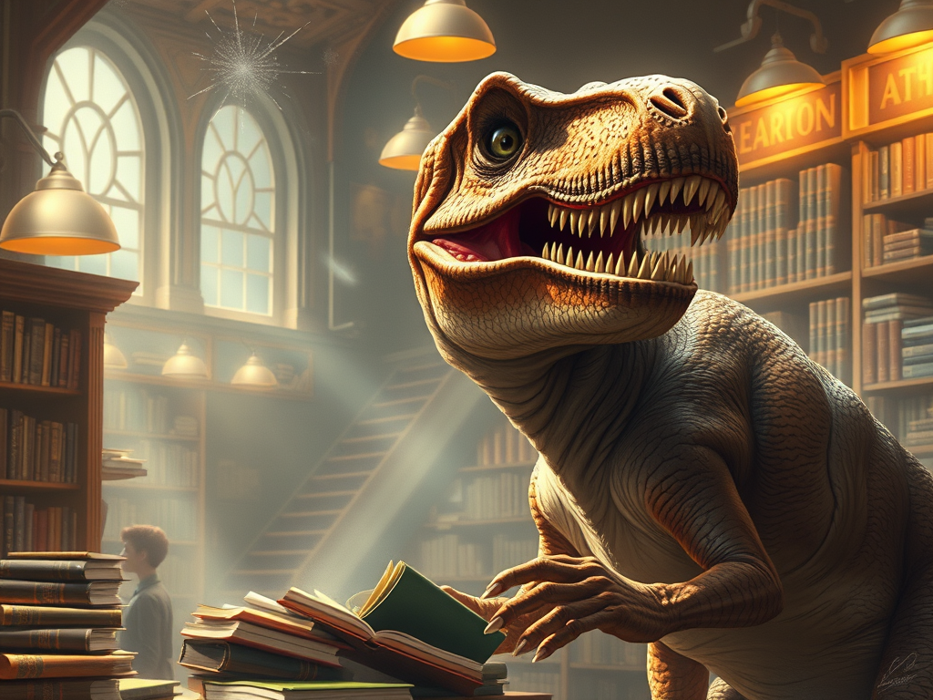 Image Credit: OpenAI Image Creator: Tyrannosaurus Rex browsing shelves of tomes